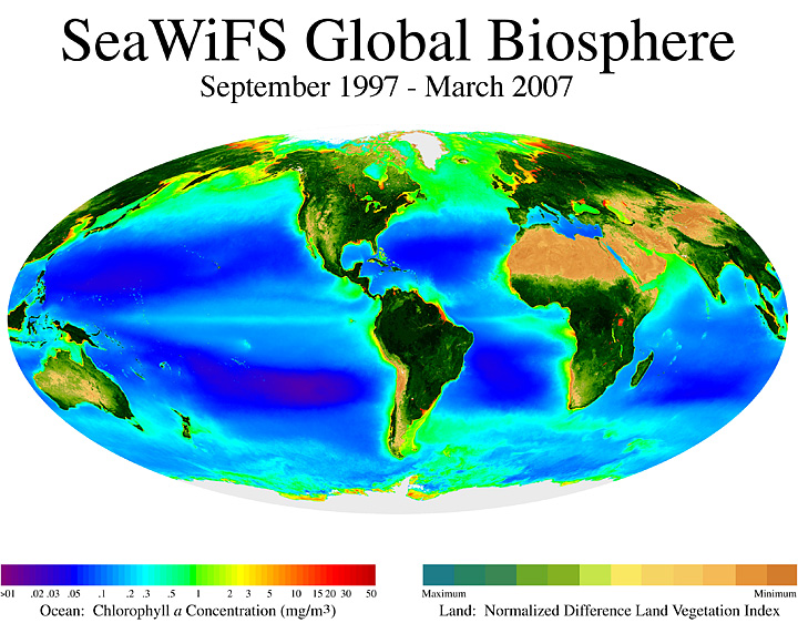 The SeaWiFS instrument aboard the OrbView-2 spacecraft has been collecting global ocean color (and land color) measurements since 1997. The data collected has been revolutionizing our understanding of how our home planet lives and breathes.
