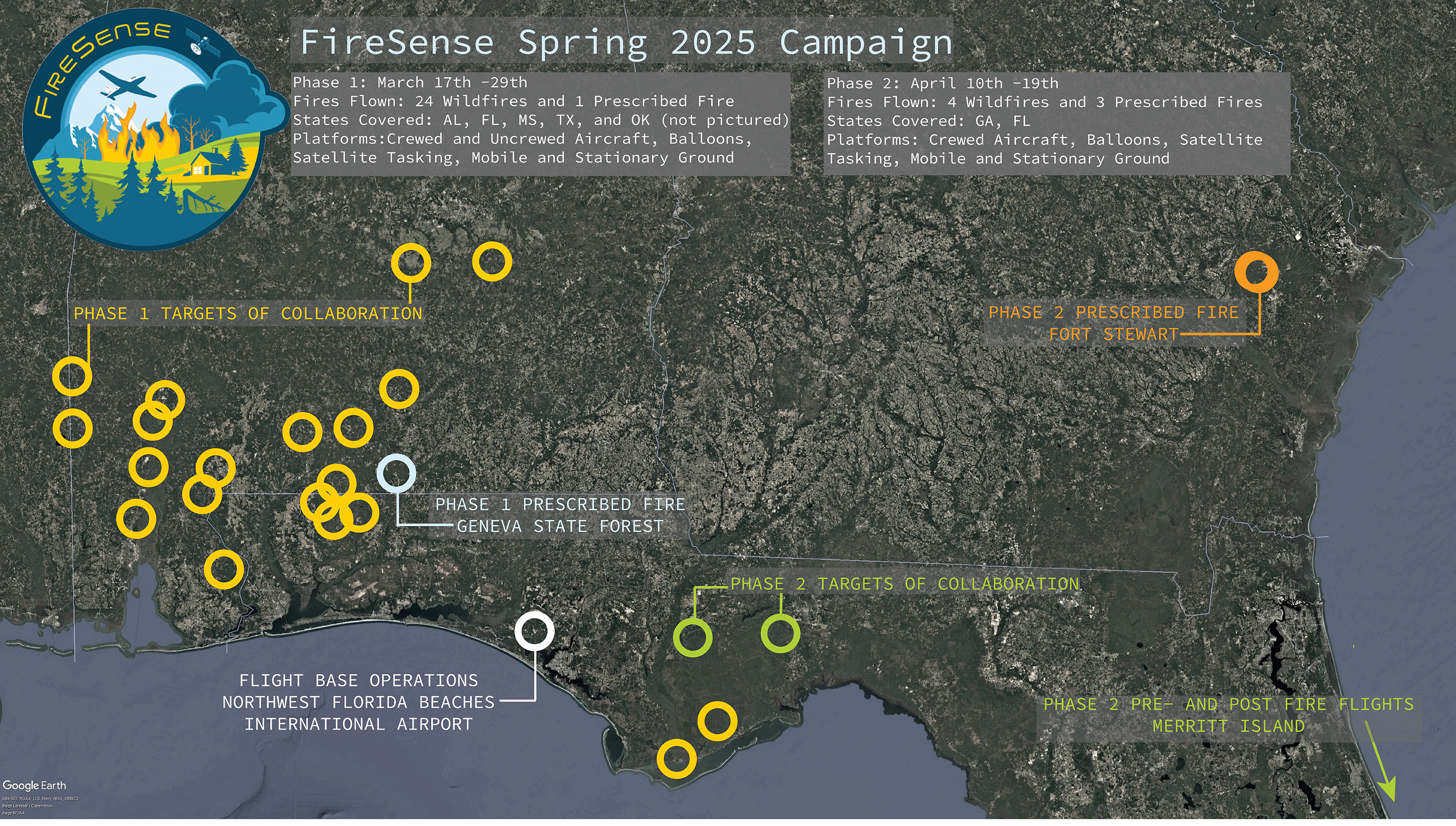 In 2025 FireSense campaign activities occurred in the southeastern United States, specifically Geneva State Forest in Alabama, Merritt Island National Wildlife Refuge in Florida, and Fort Stewart in Georgia, as well as surrounding states including TX, MS and OK. Primary objectives include demonstration and evaluation of technology to support wildland fire management decisions and collection of measurements to validate prediction models for wildland fire and smoke management.
